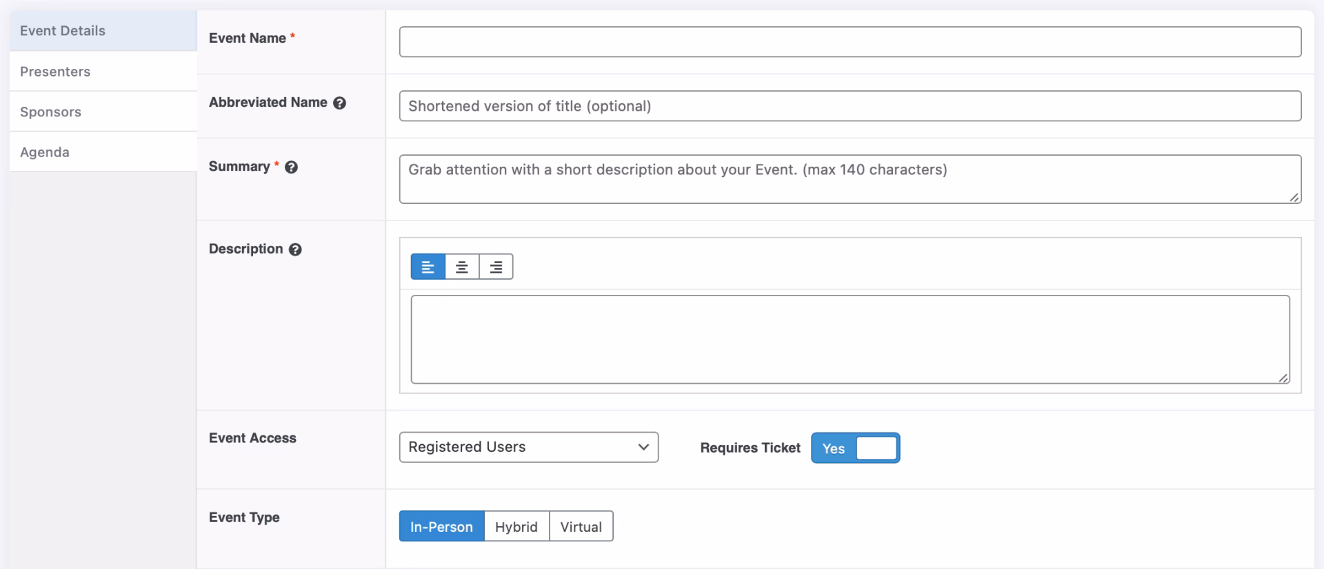 The Event Details sub-menu is where you add the main information about your event, including the event title, description, and start and end times. Required information is indicated with a red asterisk.