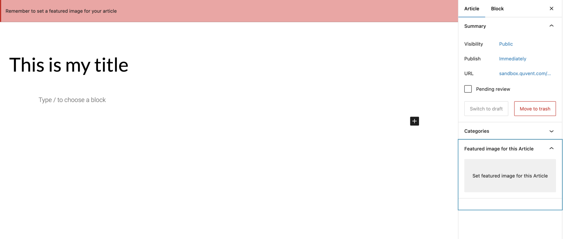 You can upload your article’s featured image by going to the right-hand sidebar and selecting Article > Featured Image for this Article