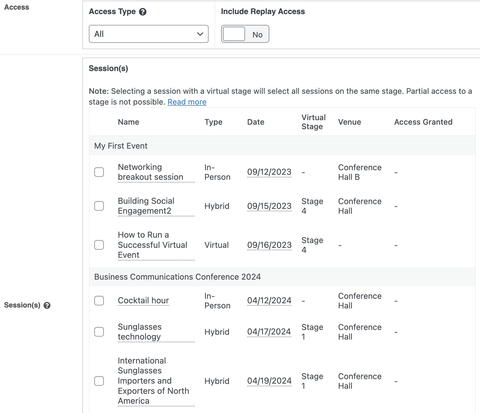 The Custom option will open up a list of all your sessions, separated by event. Above these sessions, you will see an Access section that modifies your product to allow specific access to your sessions, including in-person, virtual, and instant replay.