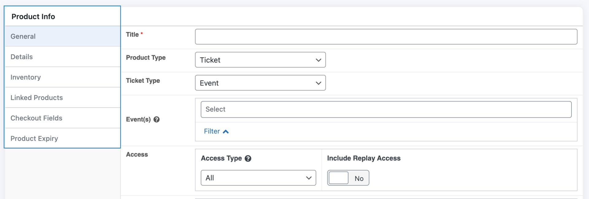 If your product is a ticket, you must specify the type of access it grants. This access can be granted per Event or Custom.