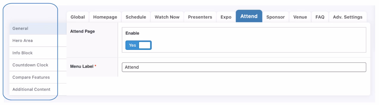 From the Attend menu, you can fully customize your event’s Attend Page. This page is intended to give your visitors extra information they might need in order to decide on attending your event. Similar to the Homepage, this tab features a sidebar with a separate row of tabs on the left-hand side. You can enable and configure different features from each tab, like a Ticketing Box and a Countdown Clock.