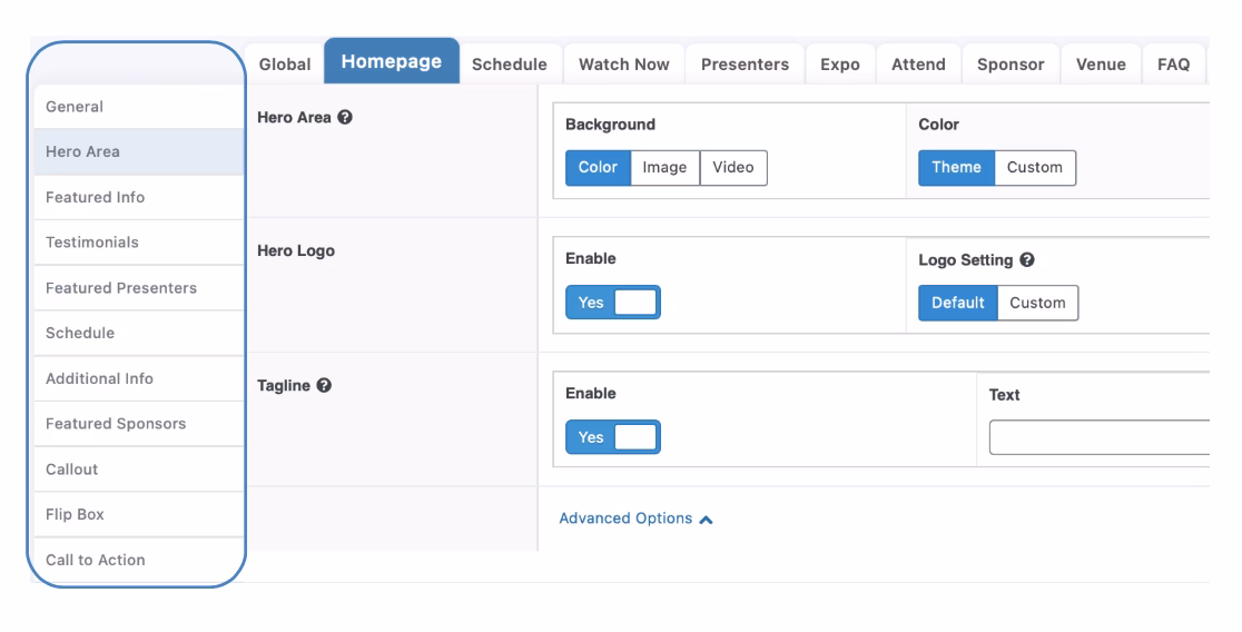 From the Homepage menu, you can edit the look and feel of your event site’s homepage. To the left side, you will see several tabs allowing you to build out your homepage. Each sub-menu corresponds with a section on your homepage. These sections can be enabled and edited at any time, allowing you to design as you go.