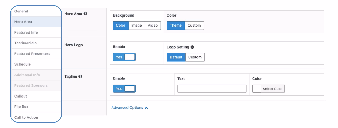 The Homepage menu allows you to customize the look and feel of your site’s landing page. You can enable and configure different features like videos and testimonials from this menu. Each feature can be independently customized from the left-hand menu.