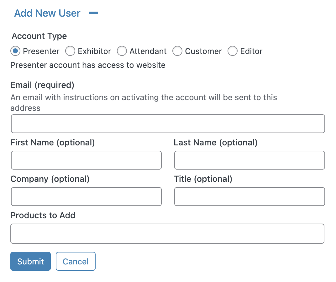 These fields include an Email, First and Last Name, Company, Title, and Products to Add. The email is a required field, and where the user will receive sign-in instructions. The following fields (First/Last Name, Company, Title, and Products to Add) are optional.